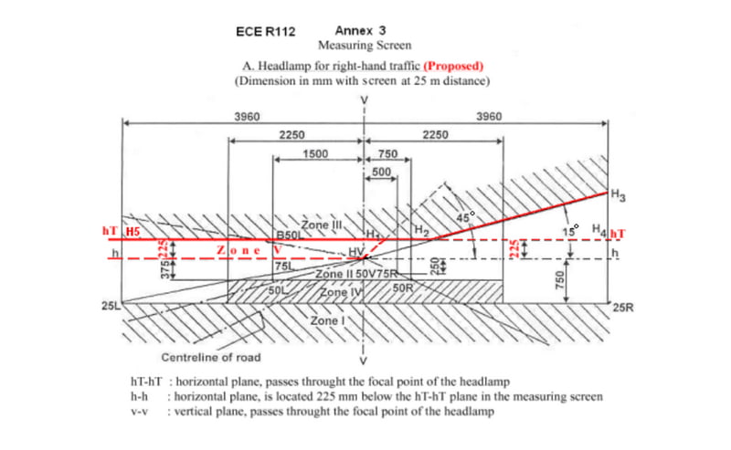 The passing beam must produce a sufficiently sharp "cut-off" to permit a satisfactory adjustment with its aid. The "cut-off" must be a horizontal straight line on the side opposite to the direction of the traffic for which the headlamp is intended; on the other hand, it must not extend beyond either the hT-hT horizontal line, 22.5 cm above the straight line H-H, passing through Points 2, and H5, H3, H4, or above the straight line H3 H2, inclined at an angle of 15° above the horizontal (see annex 3). A cutoff extending beyond line H5 H3 H2 shall in no circumstances be permitted.